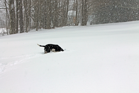 There is a lot of snow in Rowe, even with the January thaw we’ve been having. Chester has had to retool his tennis ball games because of it. His new game is to hunt for the ball once it disappears into the snowy white unknown. When we toss the ball he keeps his eyes on where he thinks it’s going to land and runs out to find it.