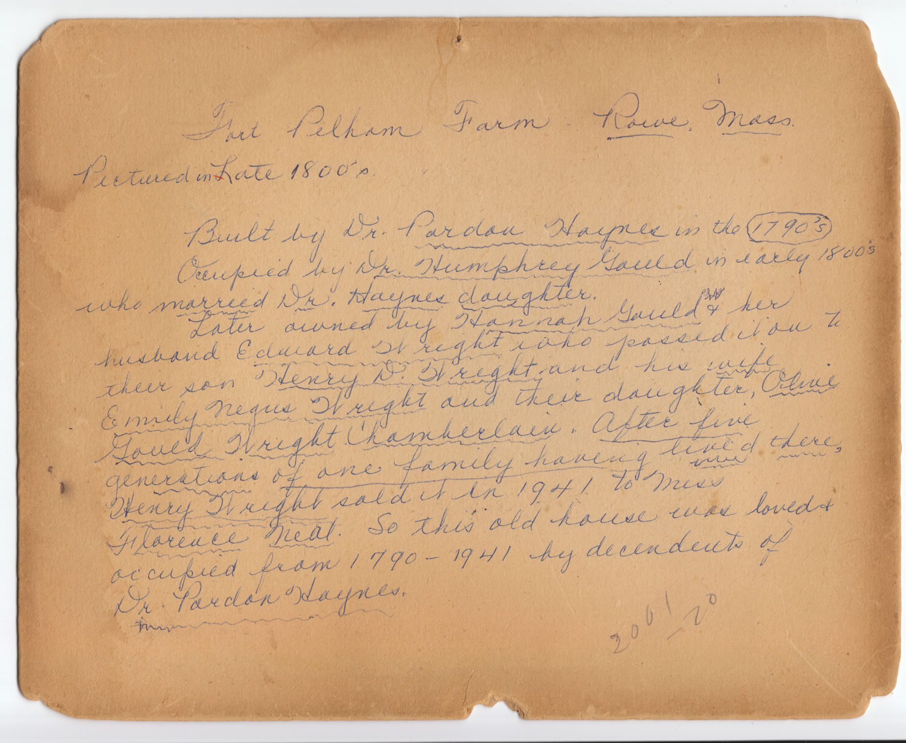 I the fall of 2008 I received a call from Alan Bjork, curator of the Rowe Historical Society, about 2 photo albums he had received with photographs of Forth Pelham Farm. Someone had taken them when Olive Wright died in a nursing home in Portsmouth, New Hampshire. Olive had no heirs of any kind so one can only imagine her belongings upon her death were headed for a dumpster somewhere. The note above was in one of the pages of one of the albums and someone was kind enough to grant her wish that these albums return to Rowe.