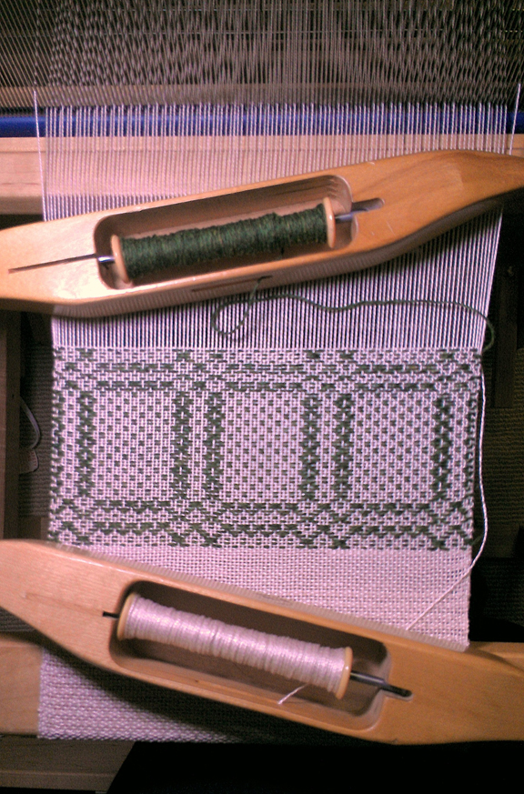 Still working on my Summer and Winter sampler/experiment. I’m beginning to understand the structure and how to do a draw down so I know how to make a design I want. Even though I have it graphed out it always comes as a bit of a surprise when I actually weave it. I’ll probably weave a couple of feet of this design and then change to different treadling to see how I can switch it up yet keep the basic design intact. It’s so beautiful and amazing to see it emerge as you weave.