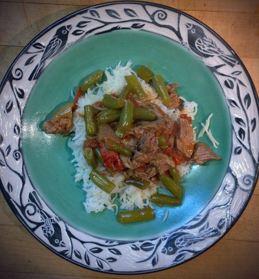 At this point I always remove the meat from the bones and return it to the stew, made with love don’t you know.  Add about a pound or so of fresh or frozen green beans and cook until the beans are tender.