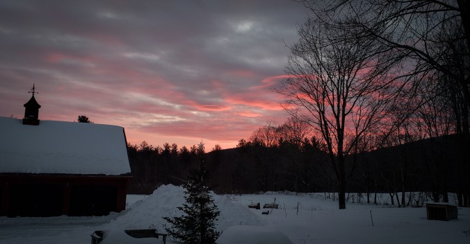 Sunrise this morning looks the same as most of the sunrises have for a while.  It was 9 degrees.  Yesterday’s high was 27.  The sap has yet to start running (other than possibly one afternoon last week) but everything is ready to go.  The snow has compressed some so the wind that has been blowing for the past few days is not whipping it into your face when you’re outdoors.