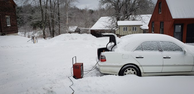 I grabbed my keys on the way out to feed the goats and chickens.  There was a crust of ice on top of the 6 inches of snow/sleet that had fallen overnight.  Heavy shoveling.  I opened the car door, inserted and turned the key – nothing – deader than dead.  I have a little jump box so figured I’d jump it so the car could thaw out.  Had to clean the car off first, my battery is in the trunk.  Put the cables on, go turn the key, nothing.  I called Bill and he told me I should charge the battery with the charger for a couple of hours.